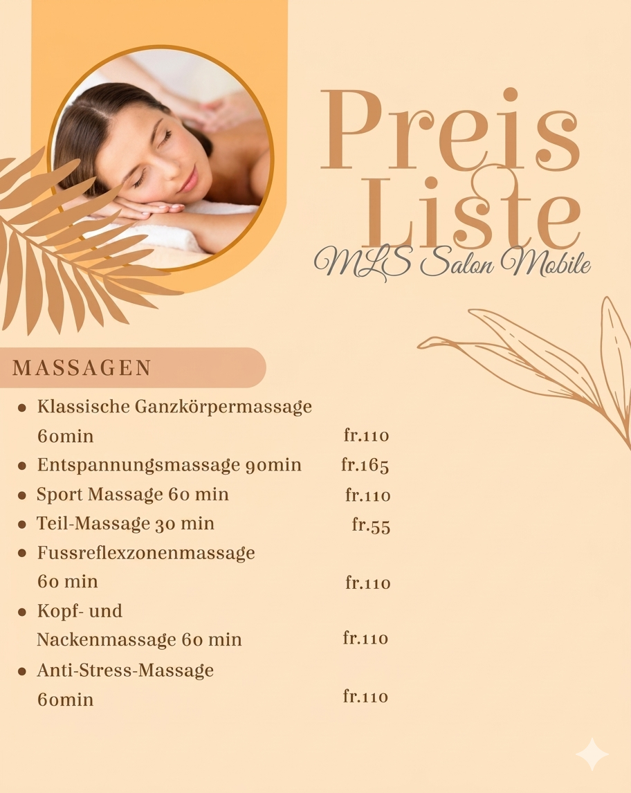 Möchten Sie dem Alltagsstress entfliehen, ohne das Haus verlassen zu müssen? MLS Salon Mobile bringt erstklassige Massageerlebnisse direkt zu Ihnen nach Hause, ins Büro oder ins Hotel. Wir glauben, dass wahre Entspannung dort beginnt, wo Sie sich am wohlsten fühlen.